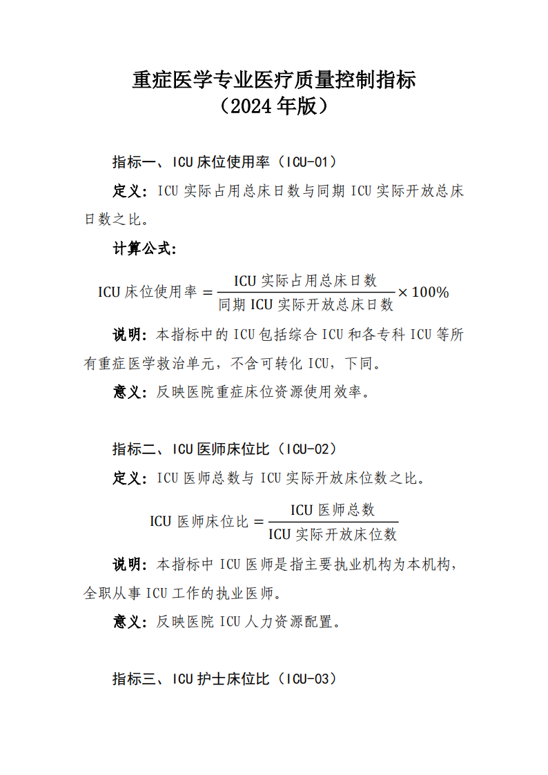 国家卫生健康委办公厅关于印发重症医学专业医疗质量控制指标(2024年版)的通知