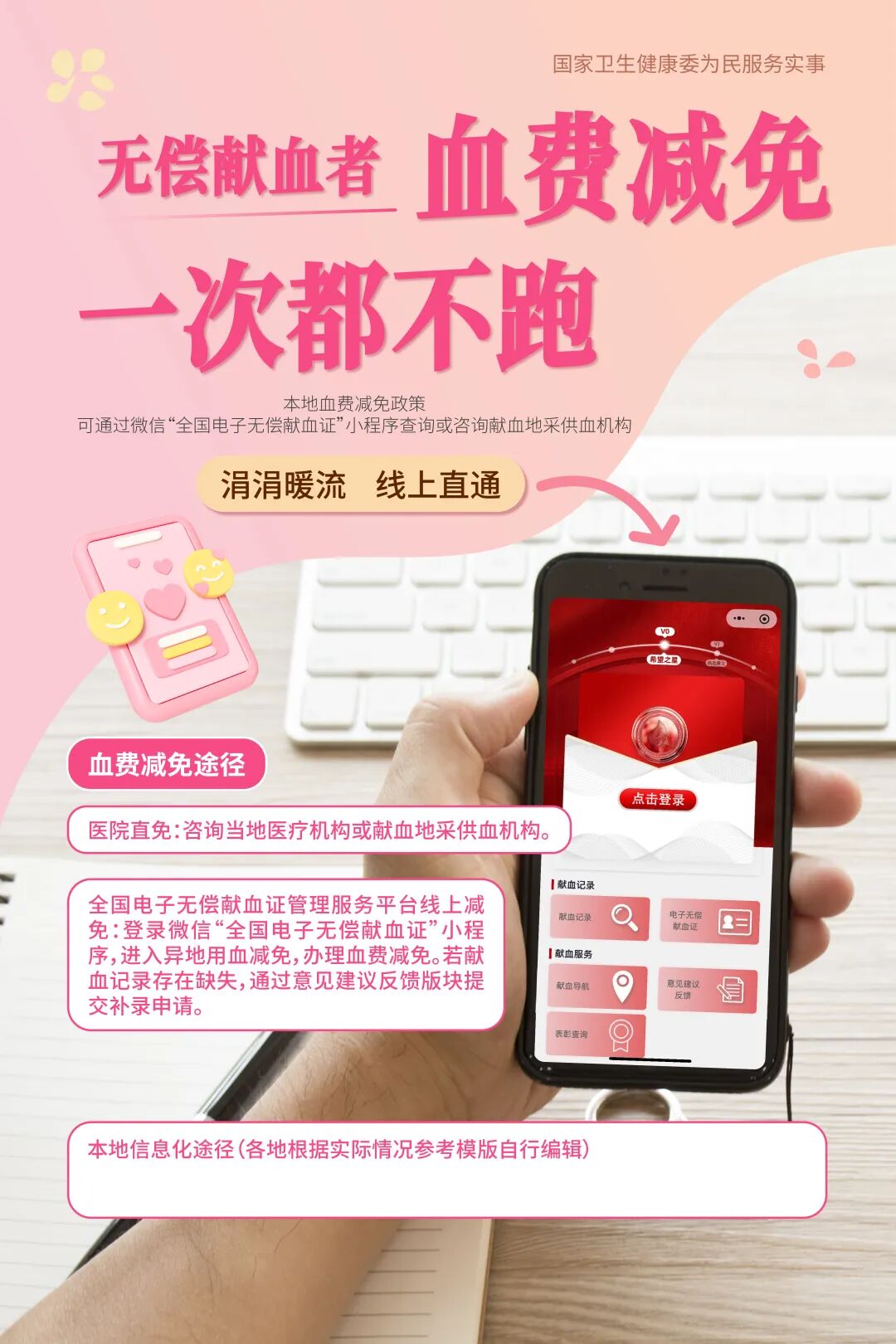 (一)各地要通过短视频、宣传片、宣传册等多种形式,广泛宣传“血费减免一次都不跑”政策,要于2025年6月30日前,在所有用血医疗机构、血站、献血点等场所张贴宣传海报(参考样式见附件),并通过短信主动提示无偿献血者查询献血记录和减免渠道,确保无偿献血者“知晓政策、会用平台”。